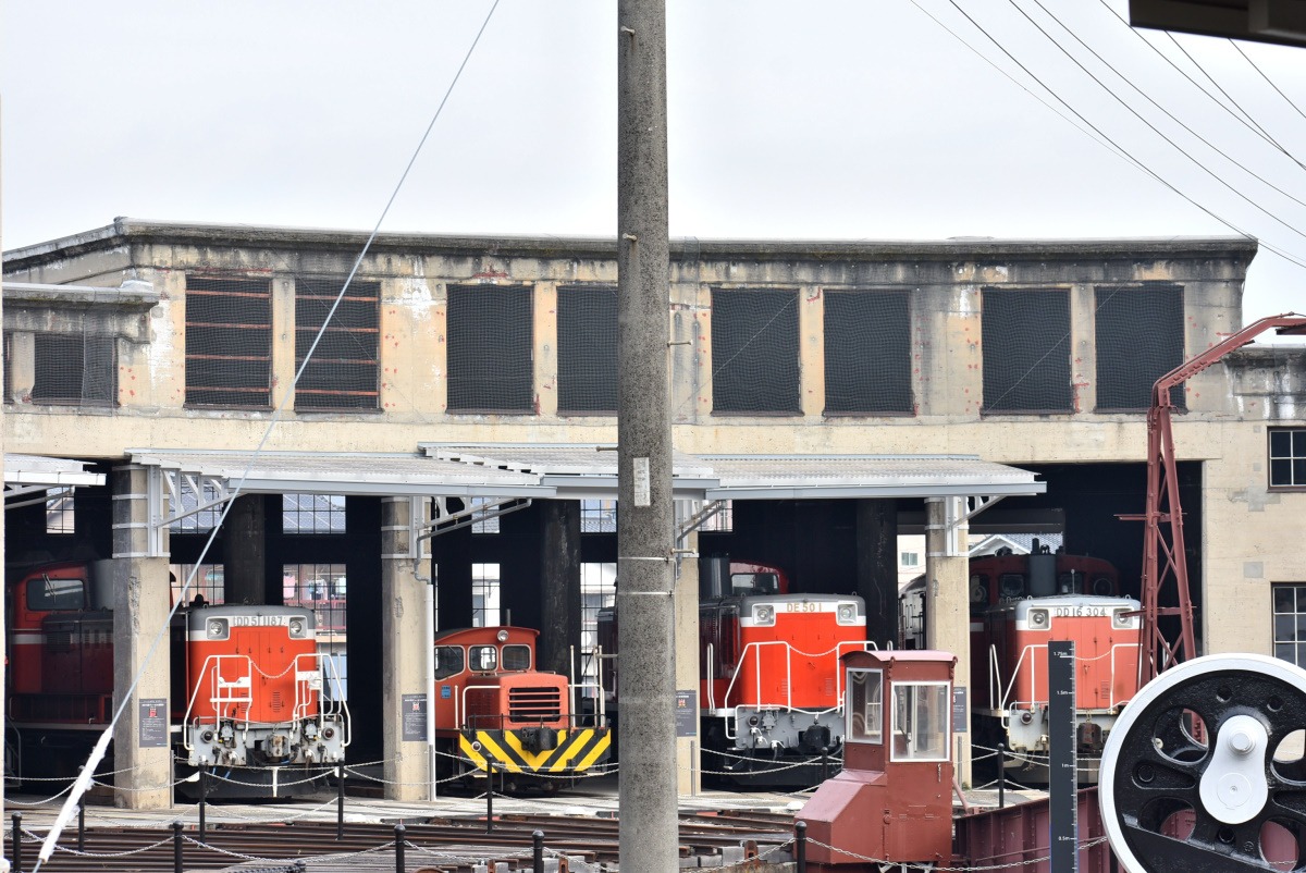 京都はSLがメインですが、津山では気動車やディーゼル機関車など多彩な車両が扇形機関車庫に展示されているので