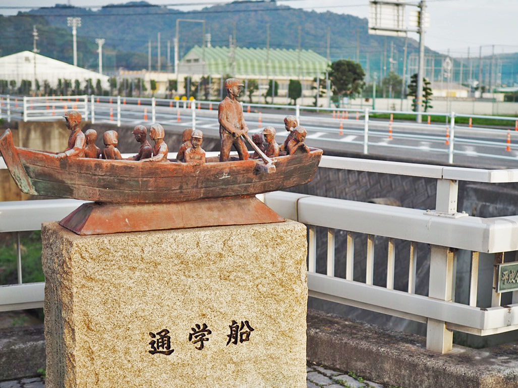 浅口市寄島町にある環状交差点(ラウンドアバウト)の西側には、通学船の像があります。