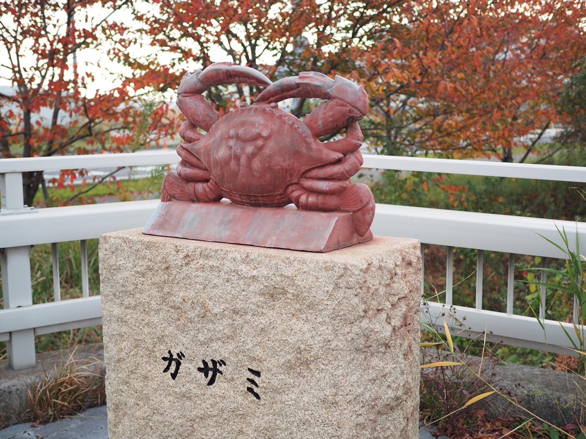 通学船の像の向かい側には、ガザミの像もあります。「ガザミ」とは寄島でたくさん捕れるワタリガニのことです。