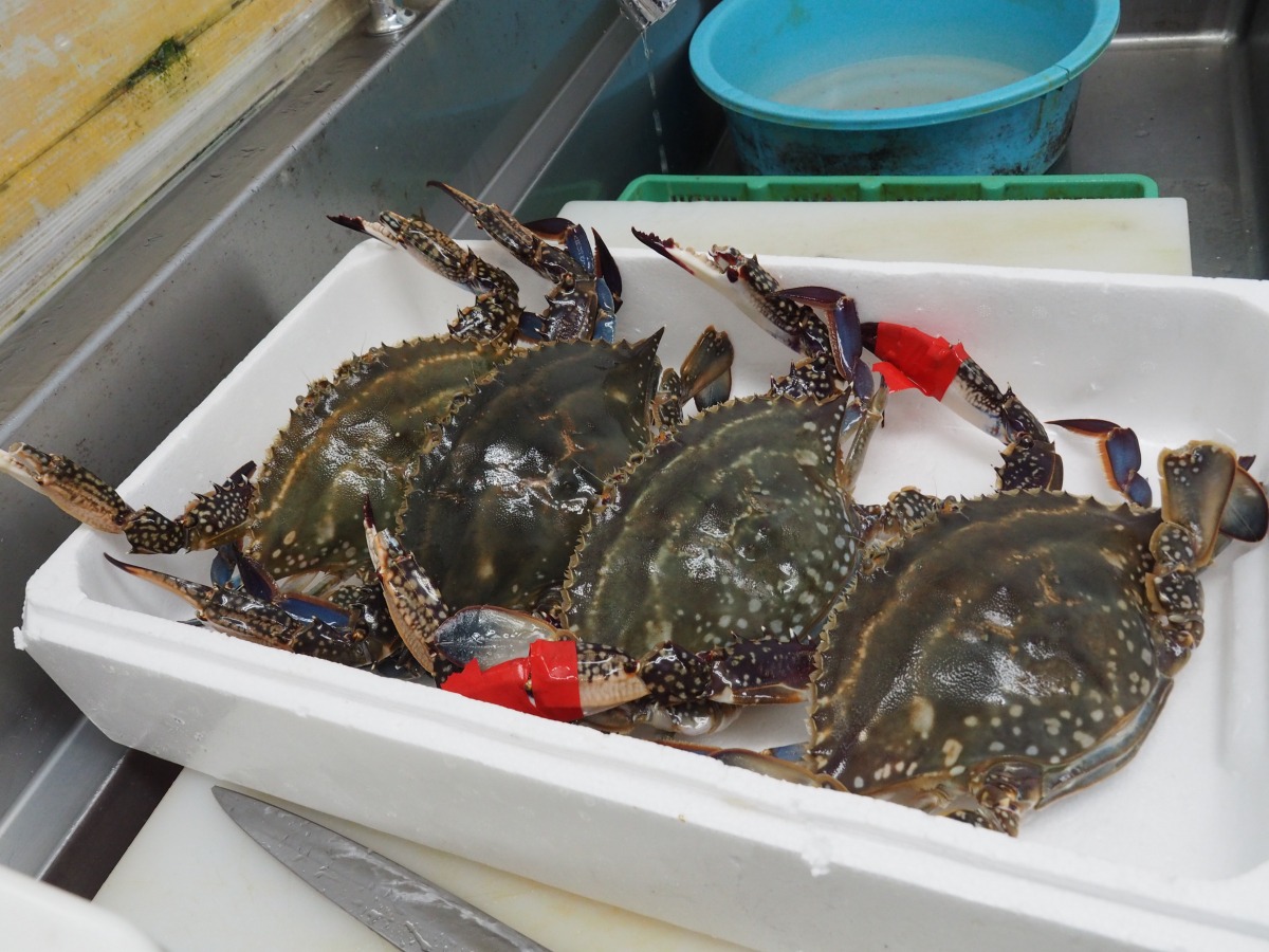 潮流の速くない寄島の海では、ガザミがゆったりと良質に育つそうです。このあたりの名産です。