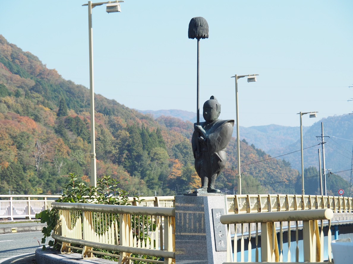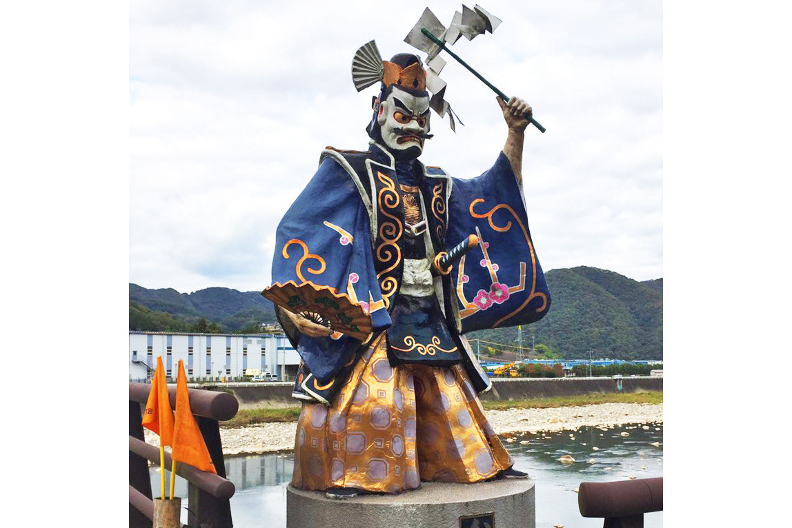 同じく新見市で見かけた、棒を持ったちょんまげ男の像。何かなと思って聞いてみると、大名行列(御神幸武器行列)に由来しているのだとか。