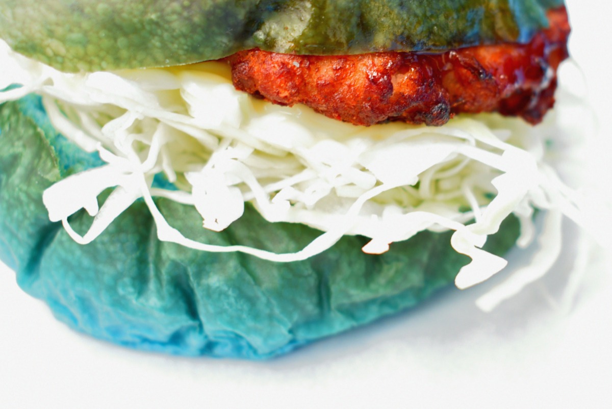 自然界の食材にほぼ存在しない青色は食欲をそそらないと言われていますが、たっぷりの千切りキャベツに特製ソースのバーガーを一口食べれば脳はすっかり騙されてしまいます。