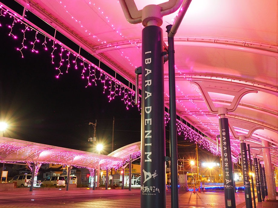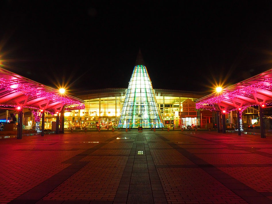 冬恒例の「ミナクルネ」というイルミネーションイベントが開催されていて、今回で15回目となります。ガラス張りの円錐形がユニークな井原駅の建物と、その周辺がライトアップされています。