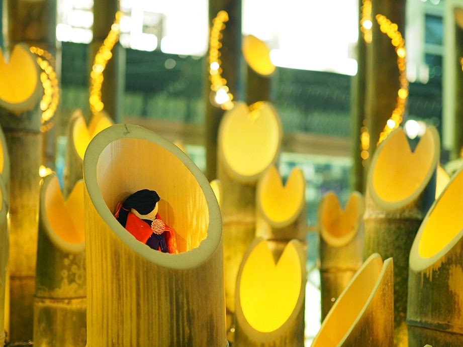 竹を使った「竹あかりオブジェ」も。こちらは地元の高校生(岡山県立井原高等学校)が製作されたのだとか。かわいいかぐや姫を探してみてくださいね!