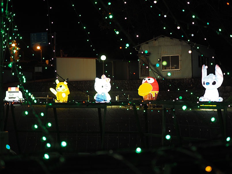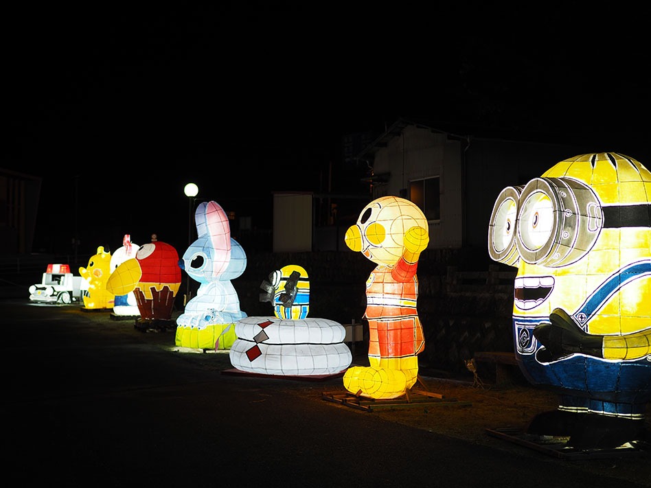 昭和63年から漫画で町おこしに取り組む高梁市川上町では、マンガ絵ぶたのライトアップを見ることができます。行ってみるとびっくり、人気キャラクターの絵ぶたがずらりと並んでいました!