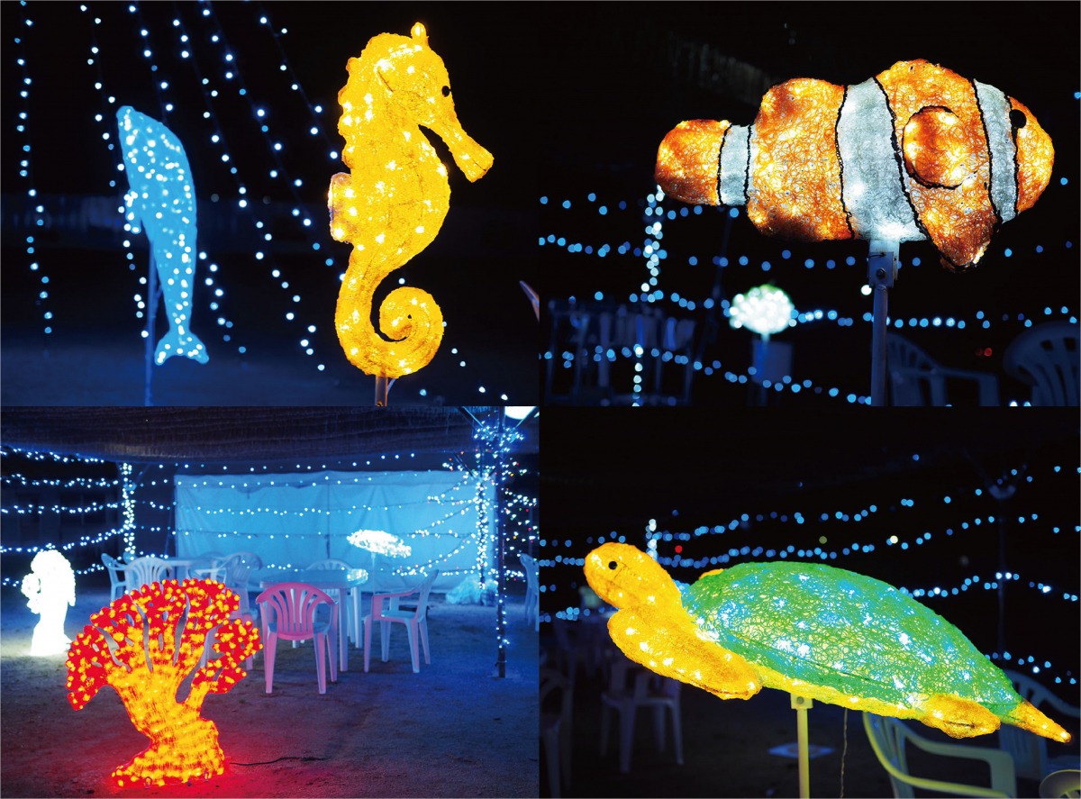 イルカ、お魚、イソギンチャク、亀など、海の生き物たちのモチーフが、ふんわりと光っていてかわいい!