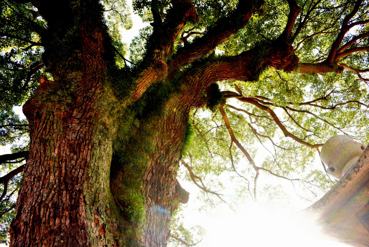 クスリの木・神秘の木などと称されることから奇しき木とも呼ばれるクスノキ。見上げているだけで樹齢150年分のエネルギーがシャワーのように心地よく注がれますよ。
