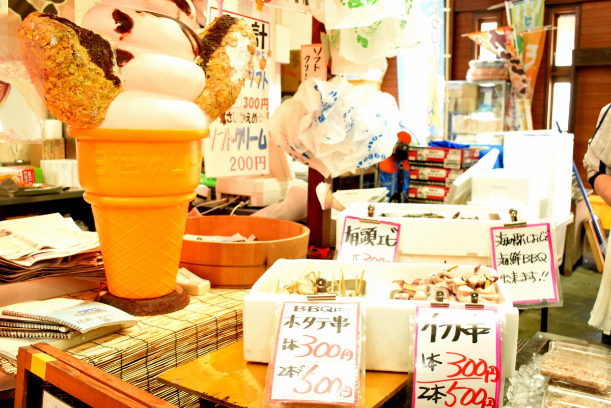 体育館のように大きくて広い日生漁協直営の「五味の市」には、有頭エビ・イカやBBQ用にすでに串に刺した魚介類、殻付きのホタテやアワビが売られています。