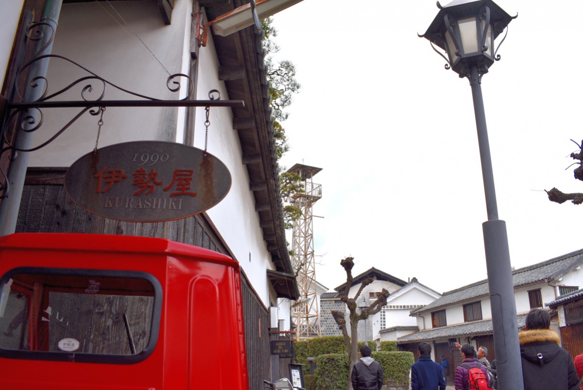 赤いVespaのオート三輪、火の見櫓、レトロな街燈。映画のセットさながらの路地では木のおもちゃやオリジナルマステが揃う「伊勢屋」さんに、地ビールが存分に味わえる「蔵びあ亭」さんと目移りします。旅館くらしきの裏口が和モダンでまた素敵。