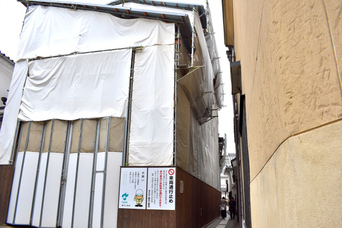 美観地区に今ものこる最古の町家建築は絶賛工事中!国の重要文化財として丁寧に保存・改修工事が行われています。改修の進み具合を日々間近に見ることができるのも完成までの貴重な体験です!