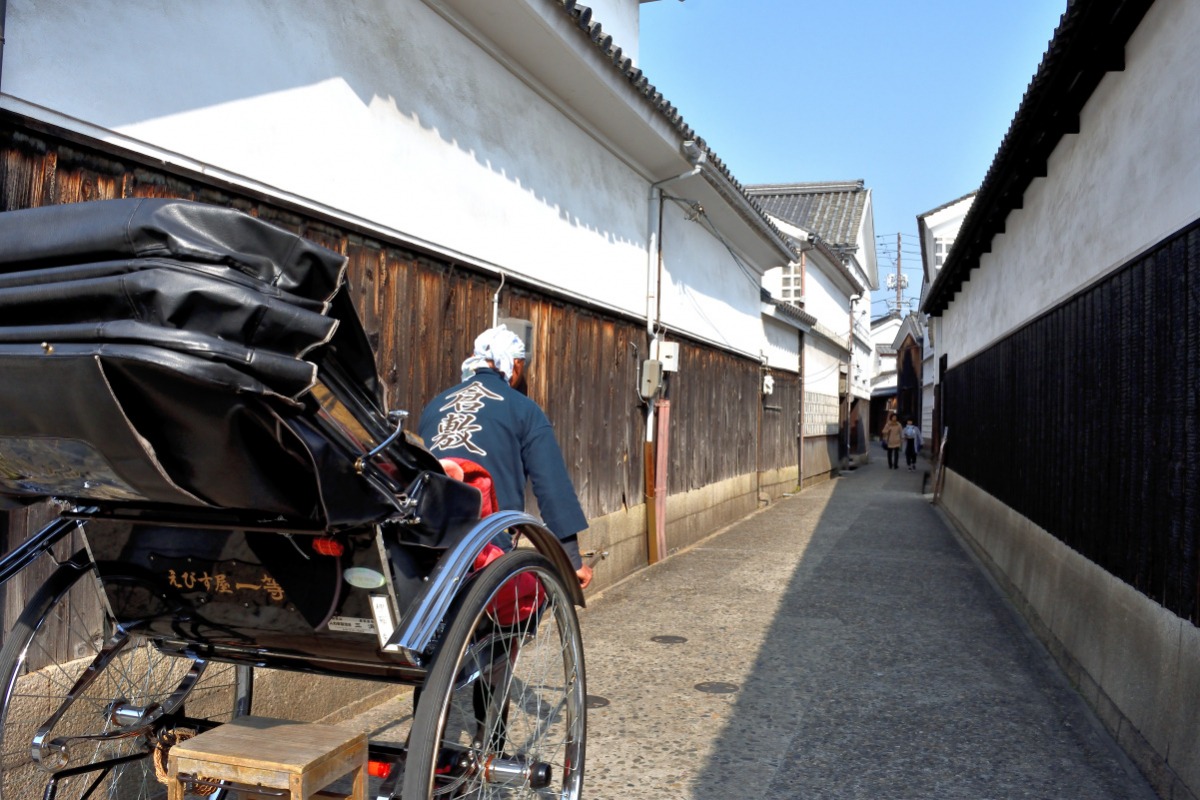 美観地区イチ美しい!と称される路地は美観地区入り口からすぐです。黒板壁や白壁の古き良き路地の先にはリノベされた新エリアが現れ、まるでタイムトラベラーな気分に。黒い大きな人力車が脇を走り抜ける臨場感は倉敷路地めぐりの醍醐味です。