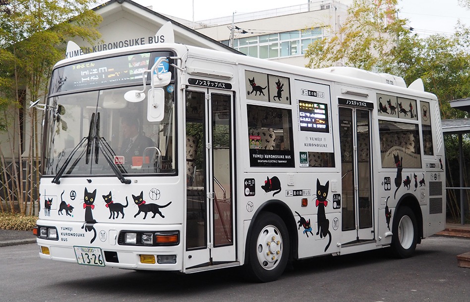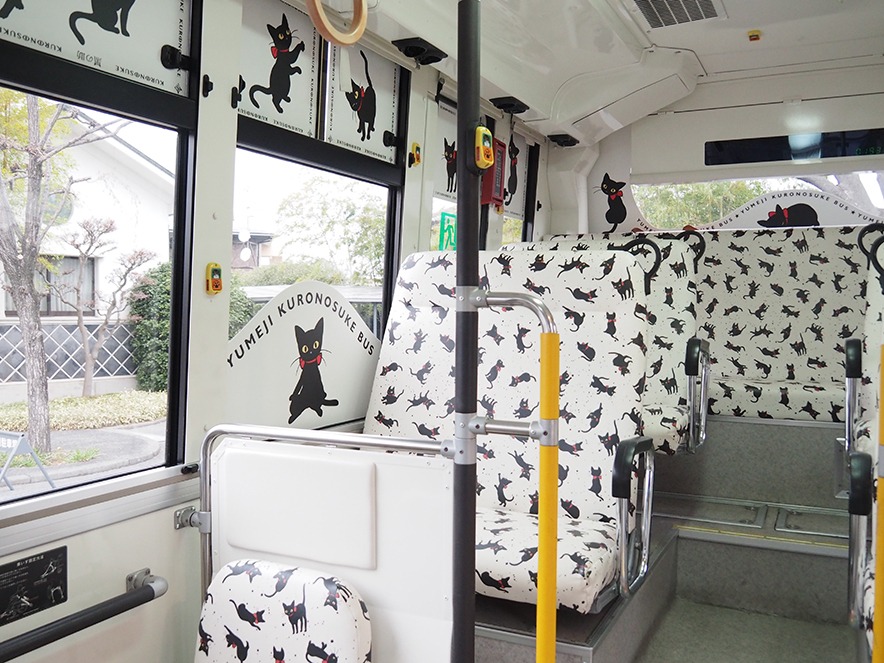 夢二郷土美術館お庭番の黑の助くんが描かれた、めちゃくちゃかわいいバスです。なんと内装も黑の助くんだらけ!