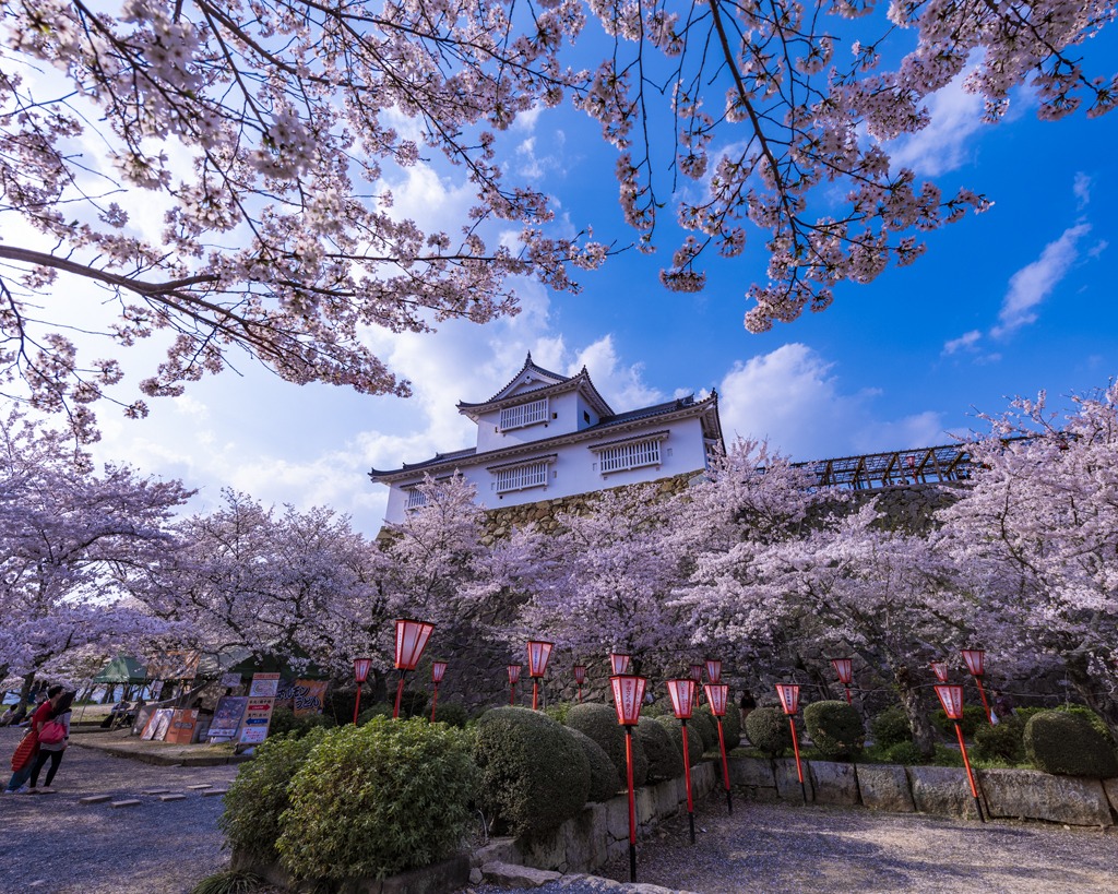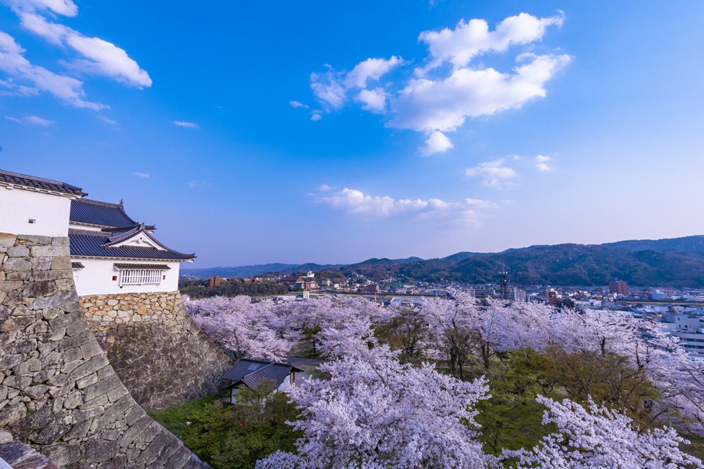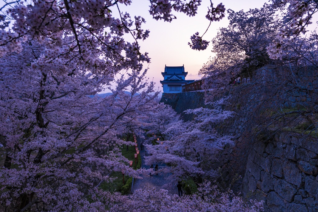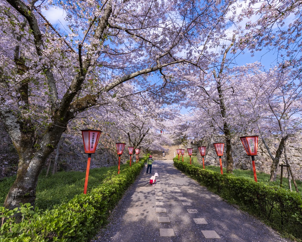 「日本100名城」「日本さくら名所100選」に選ばれている津山市のシンボルです。本能寺の変で討死した森蘭丸の弟、森忠政が1616年に築城しました。明治の廃城令によって建造物はすべて取り壊されましたが、2005年に築城400周年を記念して備中櫓(びっちゅうやぐら)が復元。10m以上の高さを誇る石垣とともに新たな人気スポットとなっています。また、県内でも1、2を争う桜の名所として知られ、約1,000本の桜が咲き誇る景観は見事です。石垣の上から眺めるライトアップされた桜も圧巻です。