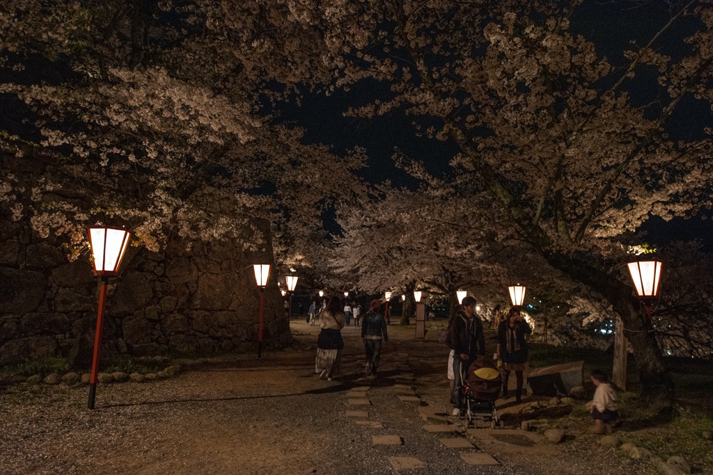 夜もライトアップされた備中櫓とともに、美しい夜桜を観ることができます。