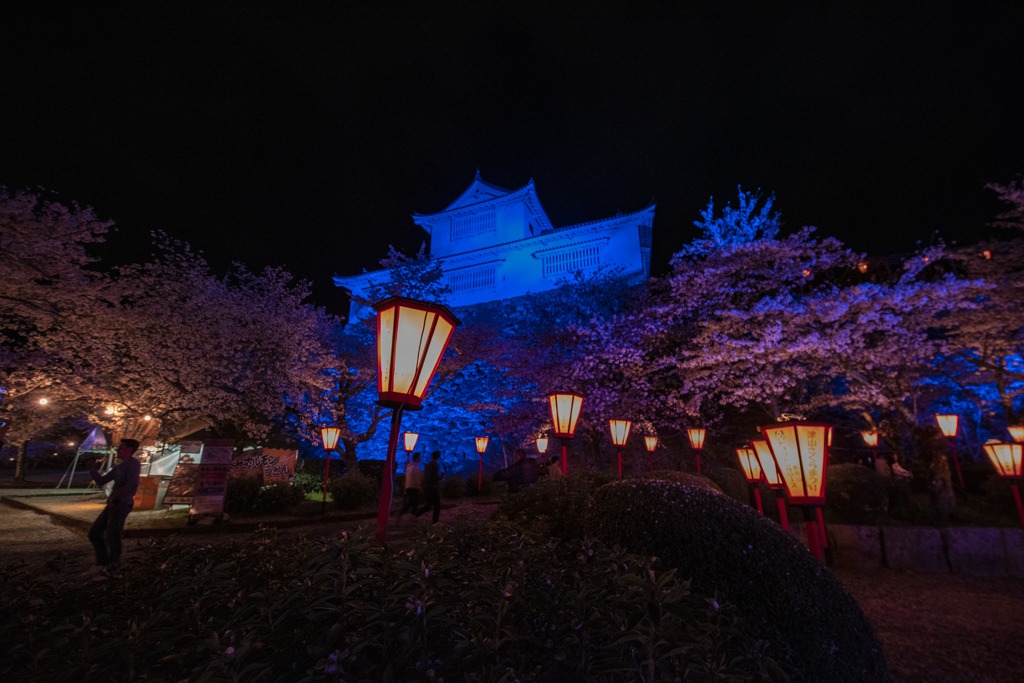 ブルーライトアップに照らされた備中櫓と夜桜です。ライトアップは、青・緑・白と定期的に変わります。ぼんぼりも美しく、奥行き感を与えてくれます。この二の丸では、たくさんのお客様が記念撮影をされています。