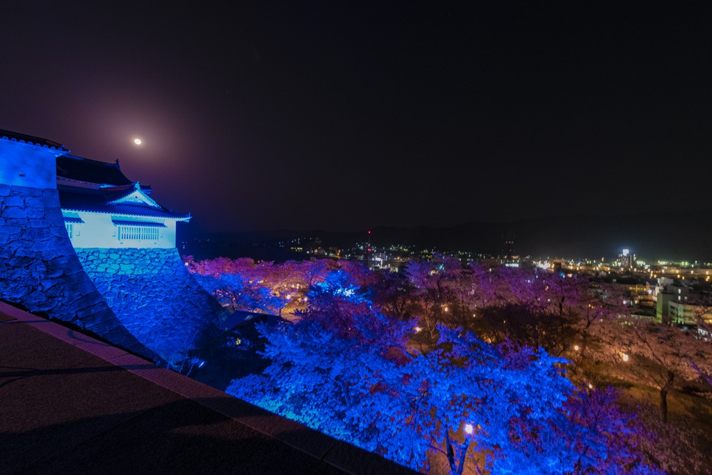 ブルーにライトアップされた備中櫓です。備中櫓の上には、明るい月が昇ってきました。お城・夜桜・お月様は、似合いますね。津山城は月を愛でる名所だと思いました。