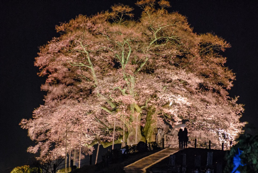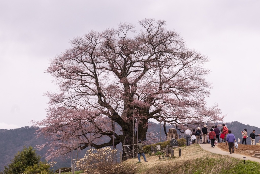 樹齢は700年とも、また地元の説では1,000年ともいわれ、この見事な桜に魅せられ毎年満開の季節になると周囲が大渋滞になるほどに多くの花見客で混雑します。