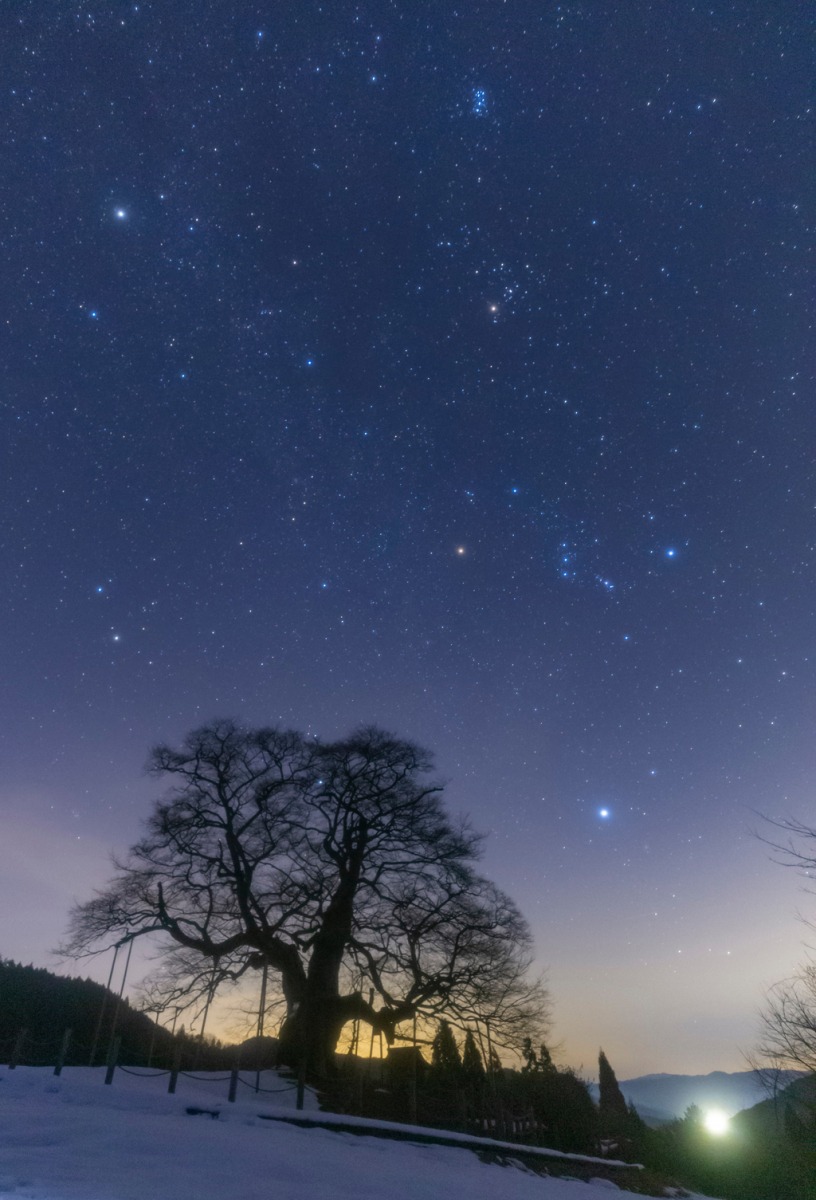 「大雪の後もあって道中は至る所でアイスバーン状態の路面。気をつけながら到着すると、桜の時期(開花時期)とは違いカメラマンはまったくおらず、凛とした世界が広がってました。桜の下で、東から昇る冬の星達をゆっくり満喫しました。」と原野さんの解説。