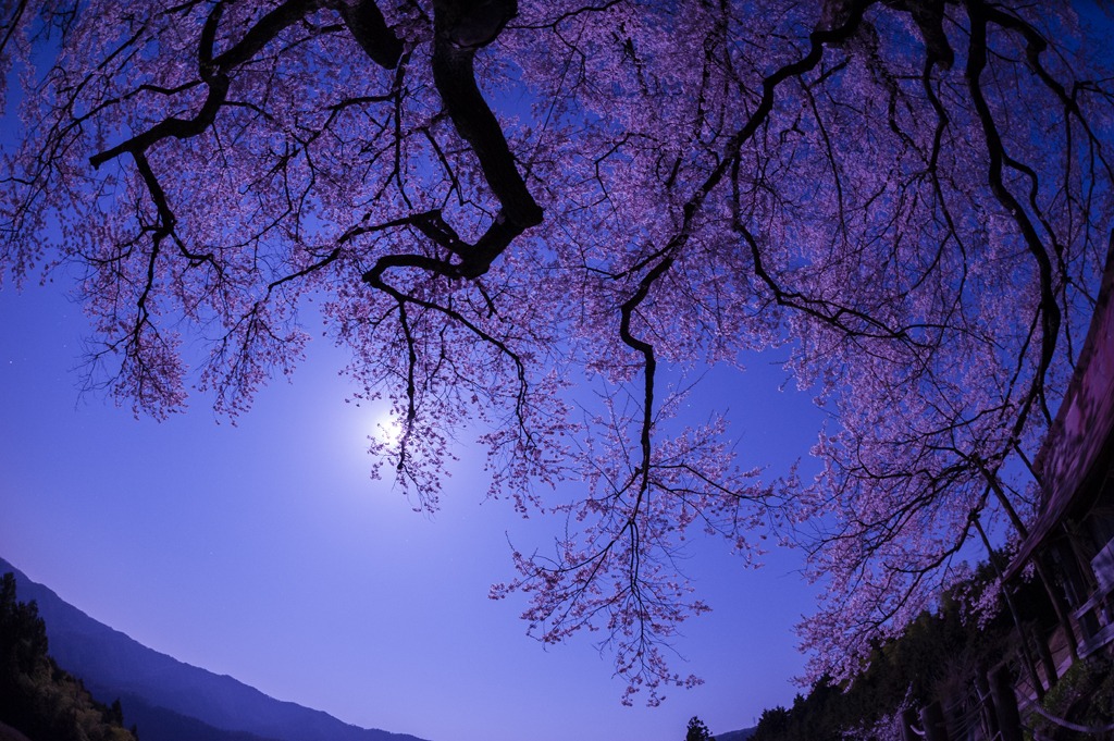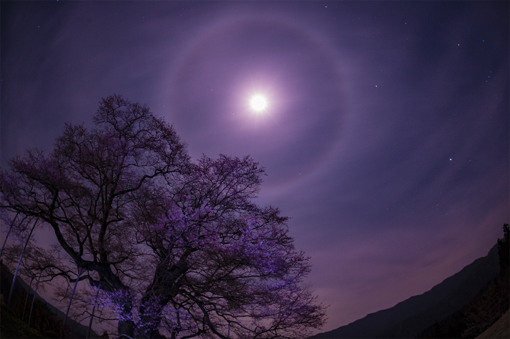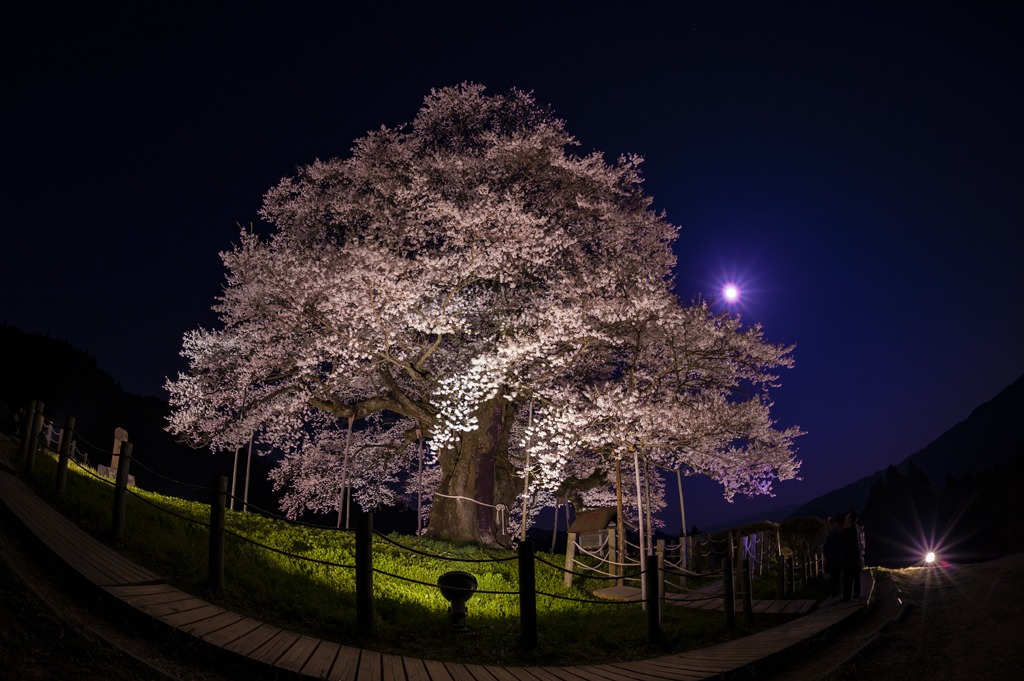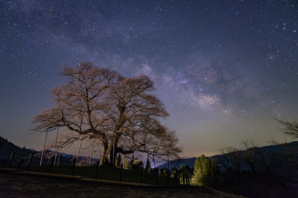 「2017年は満開時期には月明かりがあり、天の川とのコラボは出来ない為、蕾の時期に訪れました。樹齢1,000年とも言われる巨木は花が咲いてなくても見応え抜群!天の川とも良く似合います。たまたま通りがかった車のライトが上手く桜を照らしてくれました。」と吉永さんの解説。