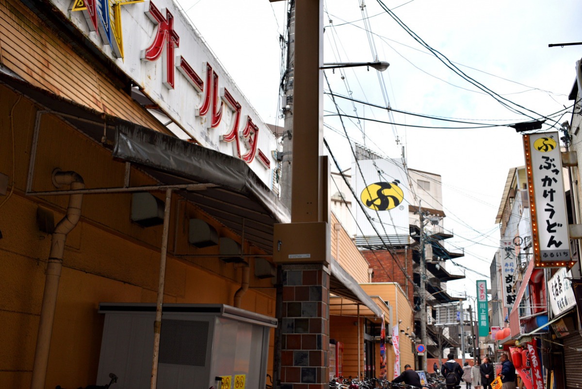 パチンコ屋さんの看板さえレトロな魅力の路地には倉敷名物がいっぱい!旅行誌常連の自家製ほうじ茶の店「つねき茶舗」にぶっかけうどん発祥の地とも言われる「ぶっかけうどんふるいち」、そして下津井タコ入りのたこ焼が味わえる「ありがとう」などが軒を連ねる駅近の小路です。