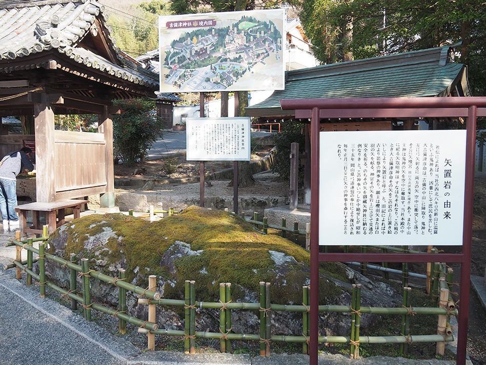神社に着くとすぐ、温羅との戦いで使った矢を置いたとされる「矢置岩」があります。まさしく、桃太郎の陣地!