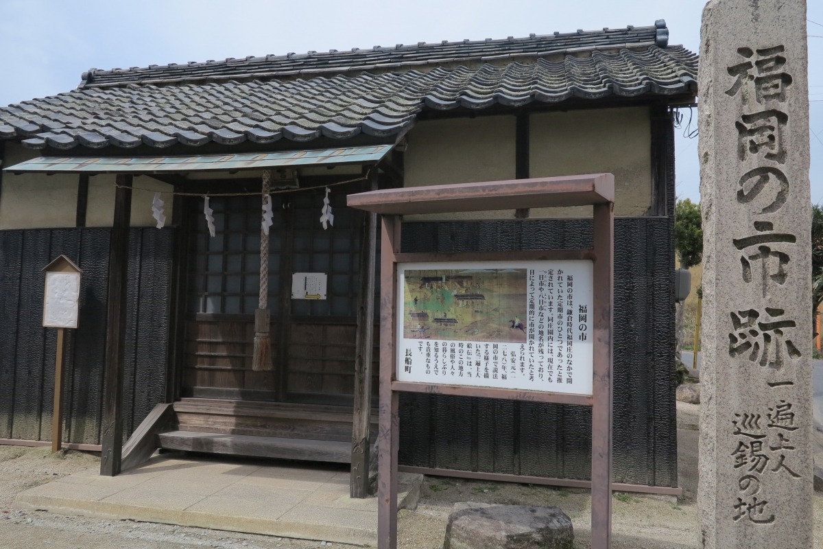 実は、国宝の一遍上人聖絵に描かれているほどの繁栄をみせていた「中世福岡の市」。九州にある「福岡」の地名も、備前福岡があって名付けられたのだとか。堤防の下に経つこの石碑は、市の跡を示しています。