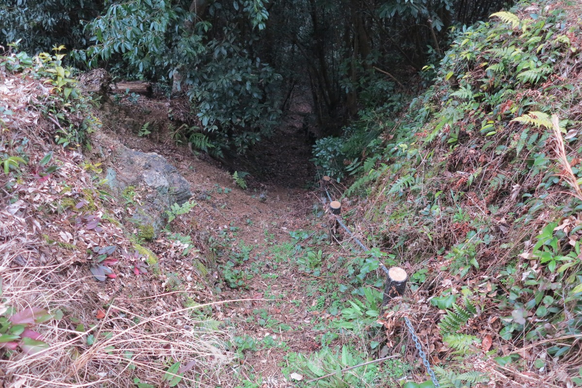 写真のように水のない空堀が100m以上にわたり続いており、鎖を伝いながら実際に歩いてみることができます。