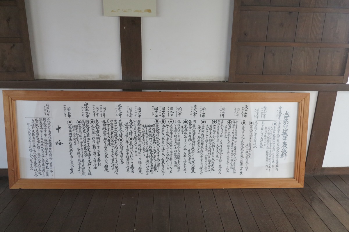 展望台に入ると壁にかけられている茶臼山城の年表や池田家との関わりについての家系図。どれも筆で直接書かれたもののようで驚かされます。しかも達筆…!