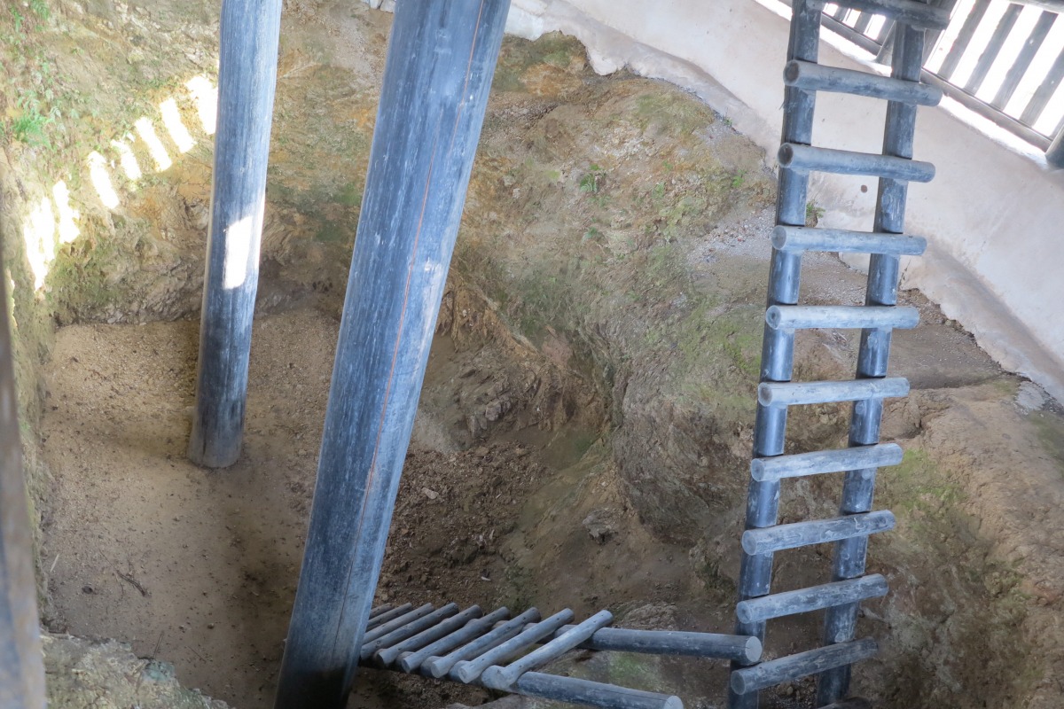 発掘調査で見つかったのは多数の出土品だけでなく、こちらの大型竪穴遺構。人が住むのに充分な大きさであるため、物品の貯蔵を兼ねた住居だったと見られています。