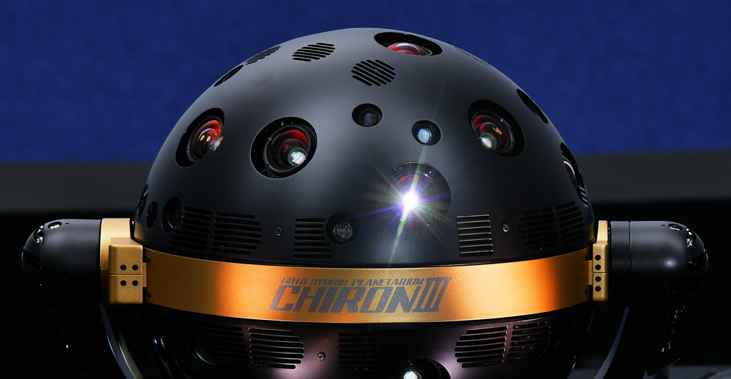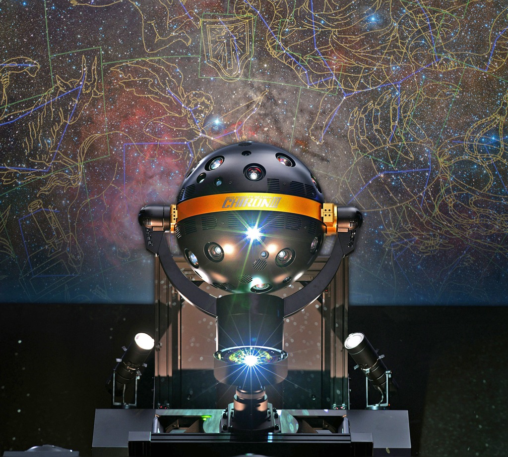 星を投映する光学式恒星投映機(プラネタリウム)「ケイロンⅢ」。映写可能な星の数は約1億個。天の川を精細に描写。肉眼で見える約9,500個の星すべてに固有の色を付加。またたきまで再現するリアルな星空表現が可能な、世界最高品質の実力を誇るプラネタリウムとして定評があります。
