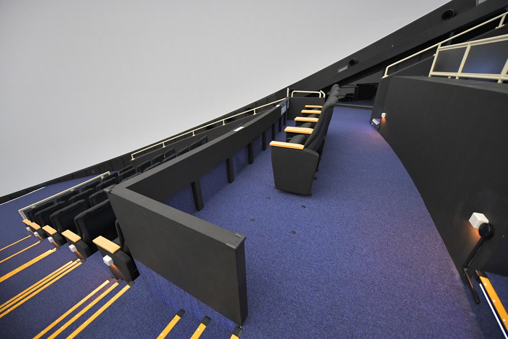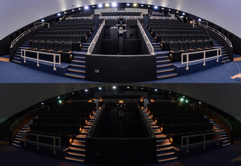 プラネタリウムのシアターは基本的に薄暗い空間です。視認性がよく段差がわかりやすい階段のステップライト、手すりの設置など、シアター内の安全対策についても強化しました。