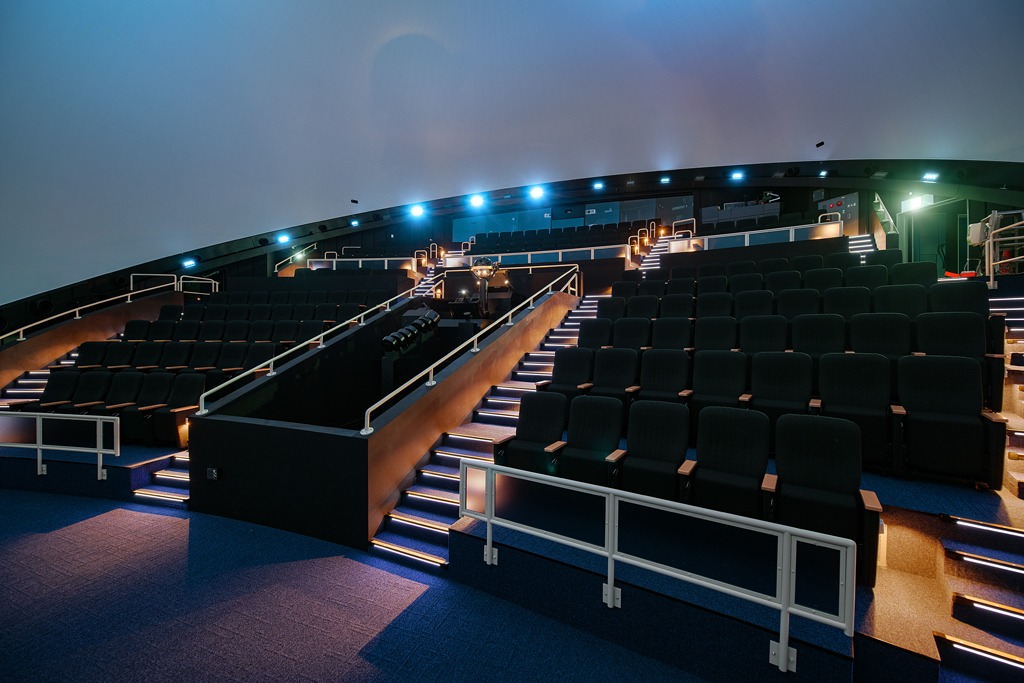 新プラネタリウムでは、入り口エントランスをはじめ、シアター空間の音響、照明、座席、内装設備も改修。空間デザインも一新しました。