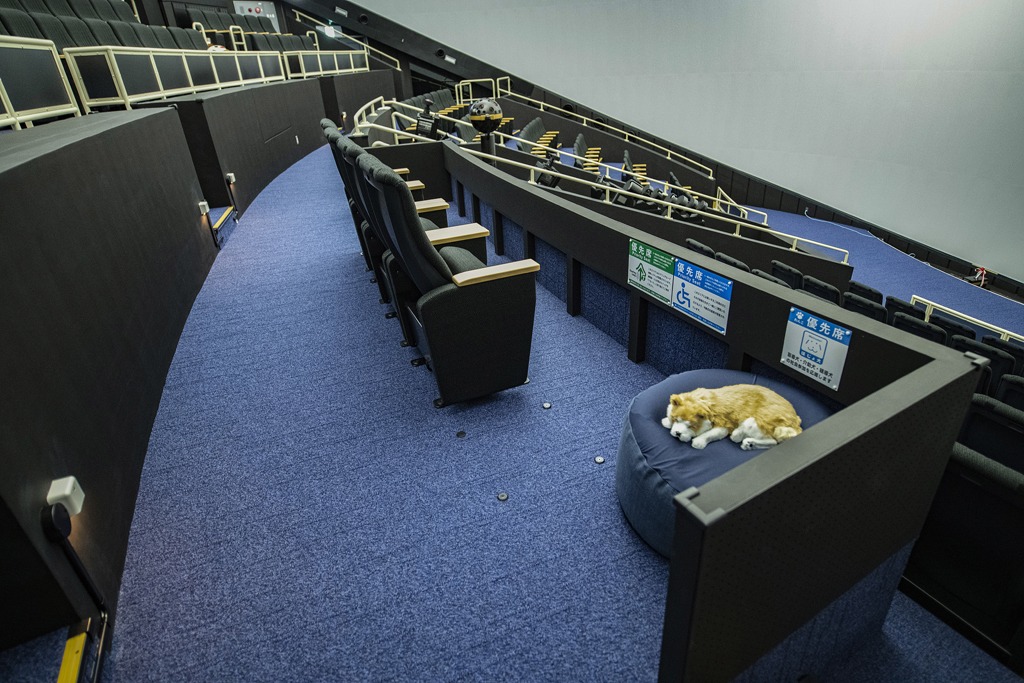 三島和久学芸員さんより、プラネタリウム機器の後方の赤色のカバーが掛かった座席がプラネタリウムを見やすい場所(写真では、右上)と教えていただきました。将来、このカバーは、取り外すかもしれません。