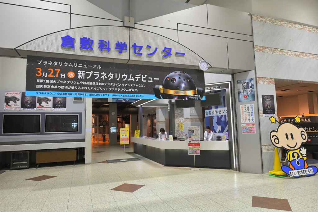リニューアルオープンの看板が目を引く倉敷科学センターの入り口です。受付にてチケットを購入します。正面の通路を入ると科学展示室になります。プラネタリウムには、写真の左側に入ります。