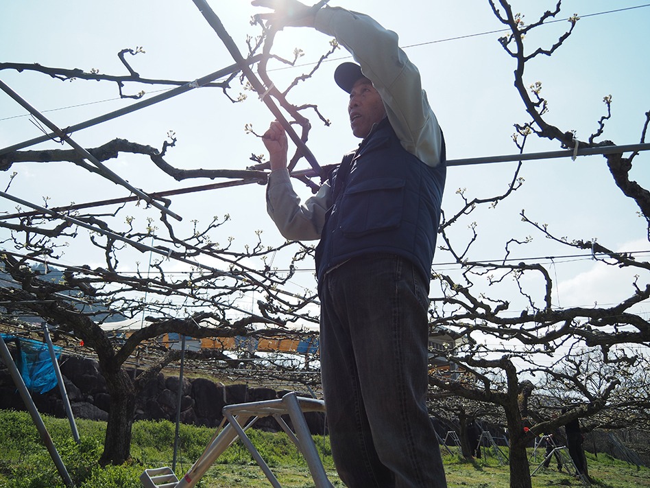 この日は梨の「花たたき」という仕事をされていました。生育の邪魔になる花を取り除いているのだそうです。