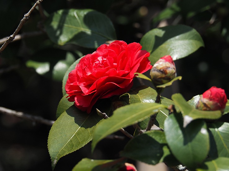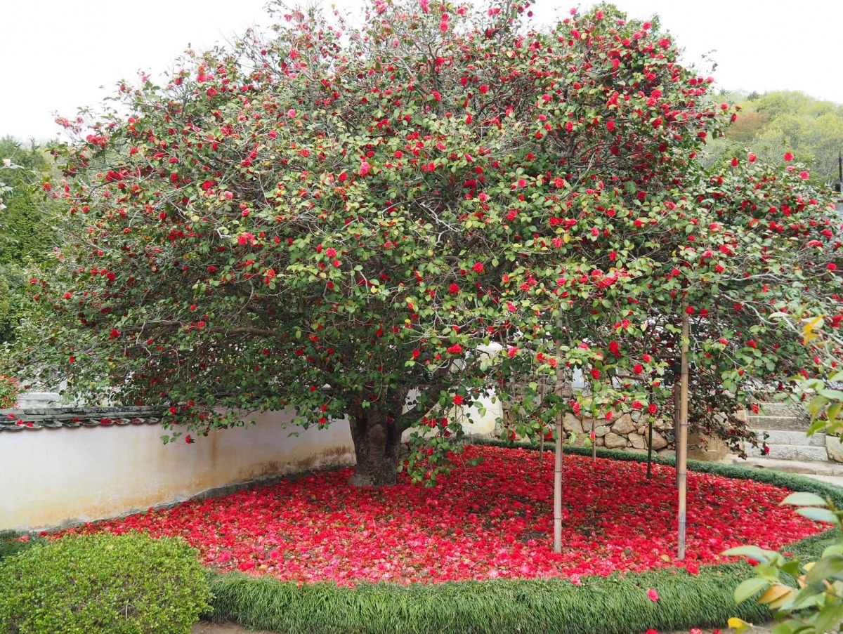 上の写真は2019年4月17日(水)現在の様子で、木の下には隙間なく椿の花が落ち、土が見えないほど真っ赤に!それはそれは美しい姿になり、たくさんの方がカメラを持って訪れます。
