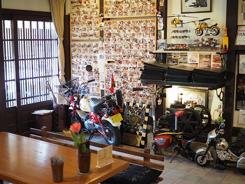 落ち着いた雰囲気の店内にはバイクや写真がずらり。バイク好きにとって、たまらない空間になっています。
