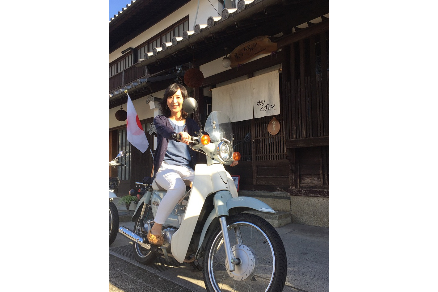 もちろん私も、カフェの美人チーフに愛車・カブ号に乗ってもらい、写真を撮っていただきました。