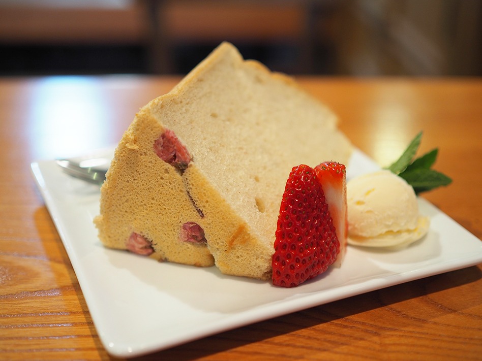 カフェメニューの中でも私のお気に入りは、シフォンケーキとチーズケーキ。今回はこの時期限定のシフォンケーキ桜味をいただきました。