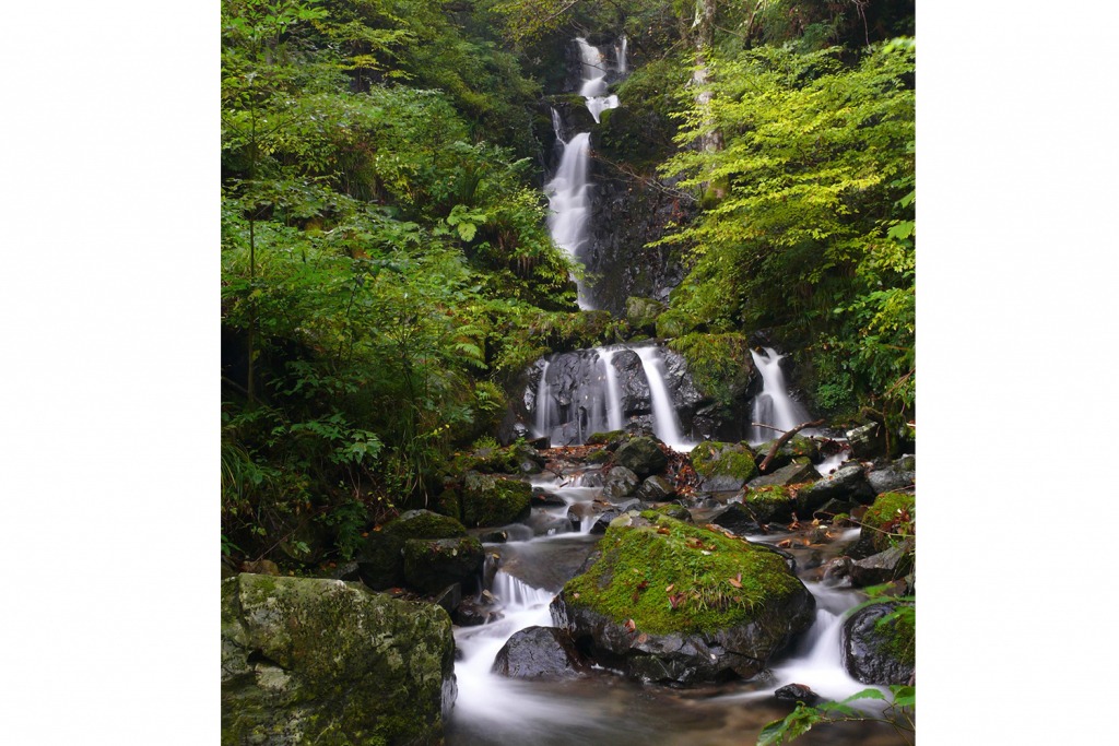 馬桑川の源流にあり、水はとても冷たく澄んでいます。戦国の武将・延原弾正の屋敷跡があったというところから屋敷の滝と言われており、深い緑に囲まれた中を約40mの高さから落ちています。