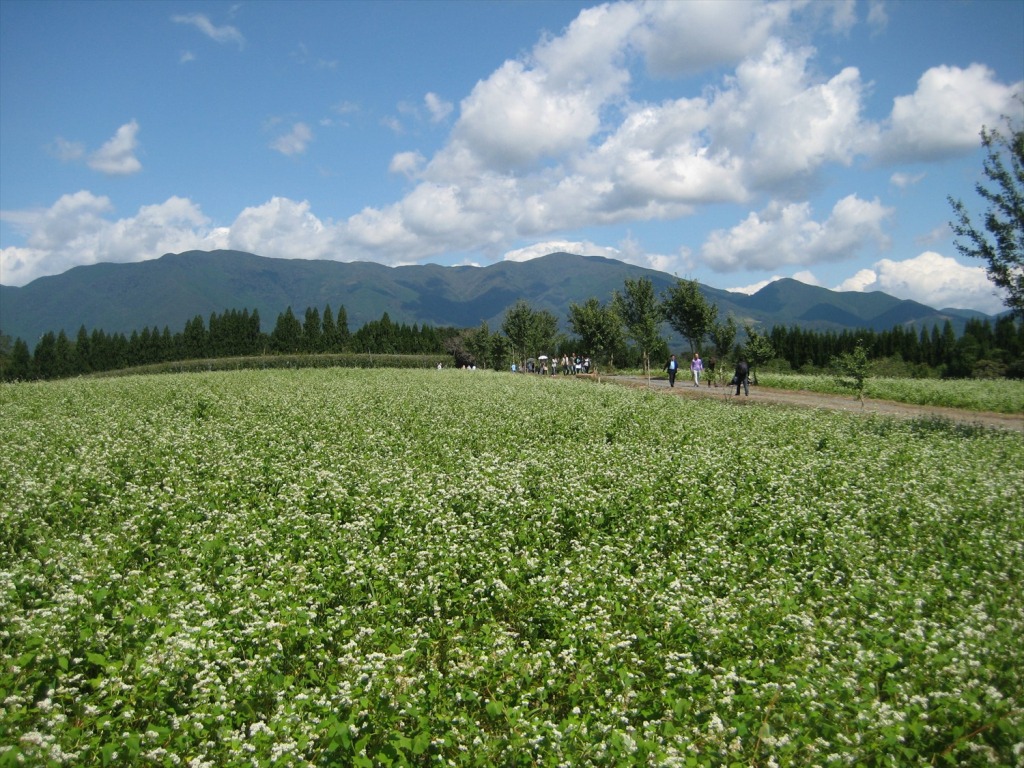 稜線美しい那岐山を背景にした3.5haの丘陵地に、真っ白なそばの花が一面に咲き誇ります。毎年9月には、「そば花まつり」が開催され、多くの人で賑わいます。