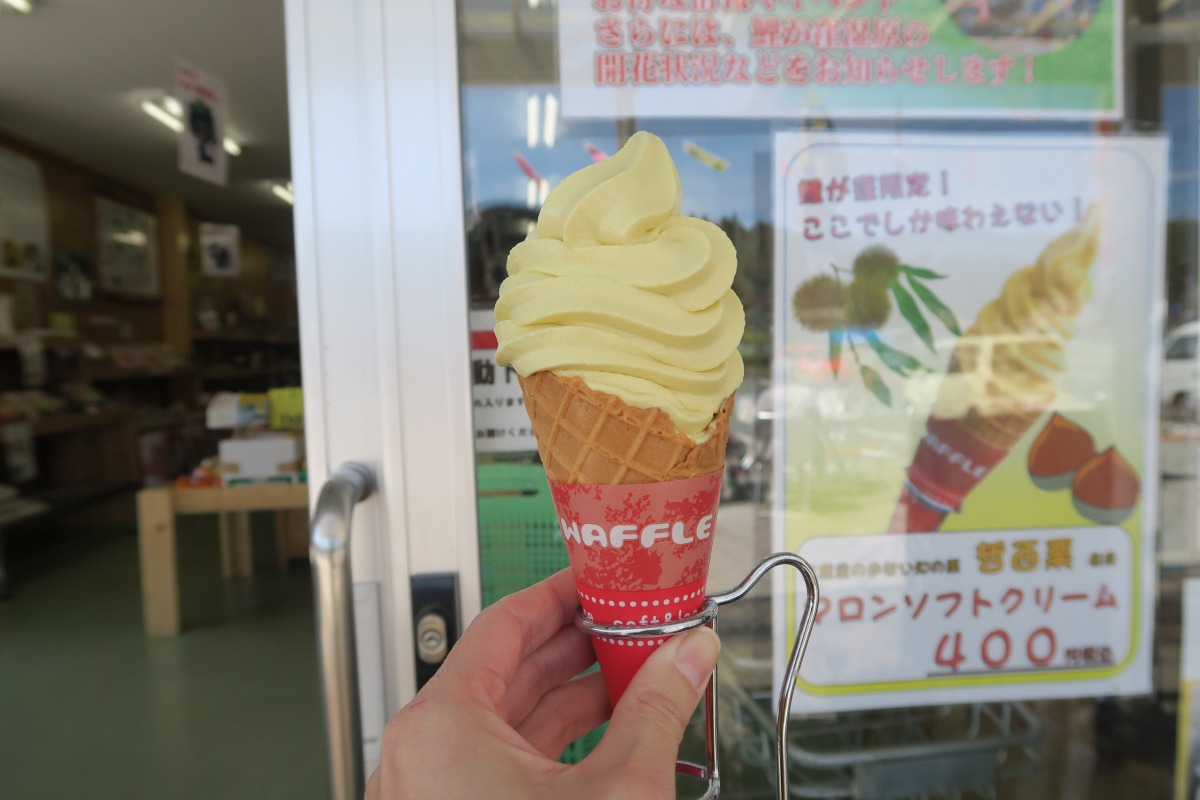 秋に収穫されるやいなや即完売する哲西栗を使ったソフトクリームも、道の駅鯉が窪限定!