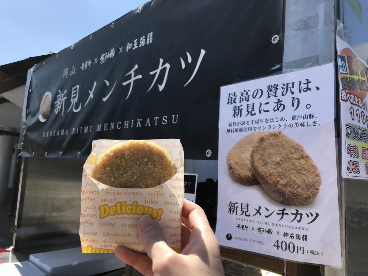 新見A級食材の千屋牛と、荒戸山豚肉を合わせた贅沢なメンチカツは、屋台で揚げたてを提供しています。