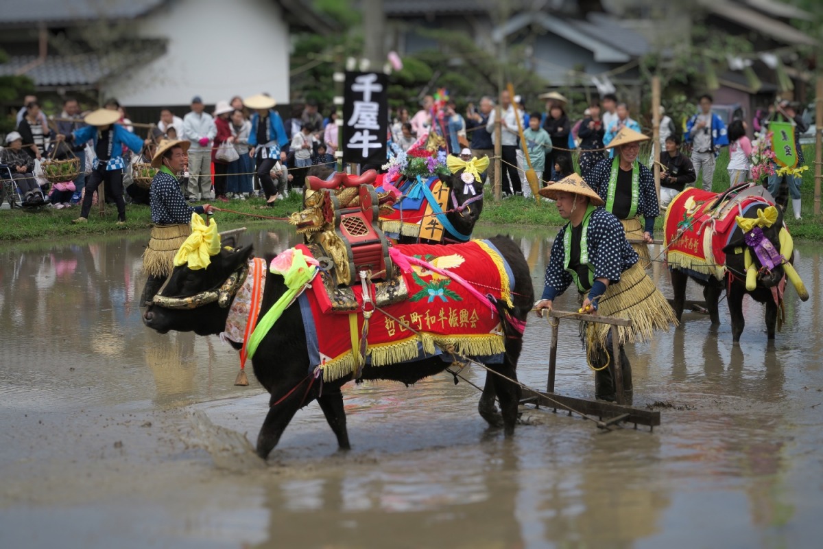 道の駅鯉が窪周辺の水田では、牛の代かきののち「太鼓田植」が披露されます。