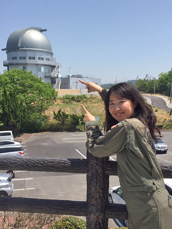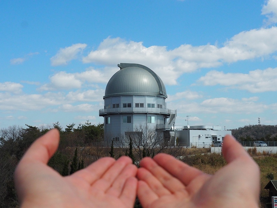 京都大学岡山天文台は中には入れませんが、外階段を上って3階の回廊部分から、窓越しにアジア最大級の京都大学3.8m望遠鏡(せいめい望遠鏡)を見ることができます。