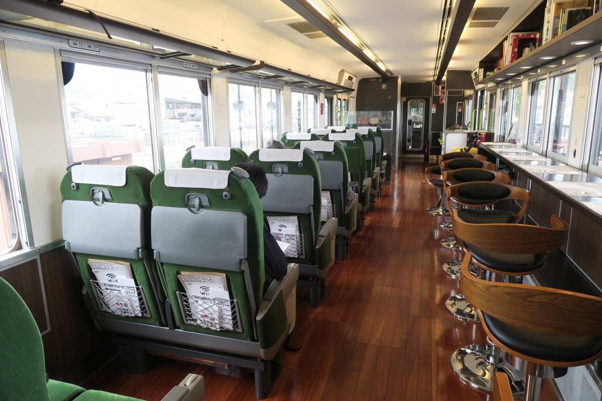 席は2種類。深いグリーンの座席が高級感を感じる2人掛けリクライニングシートと、窓の景色を楽しめるカウンター席です。