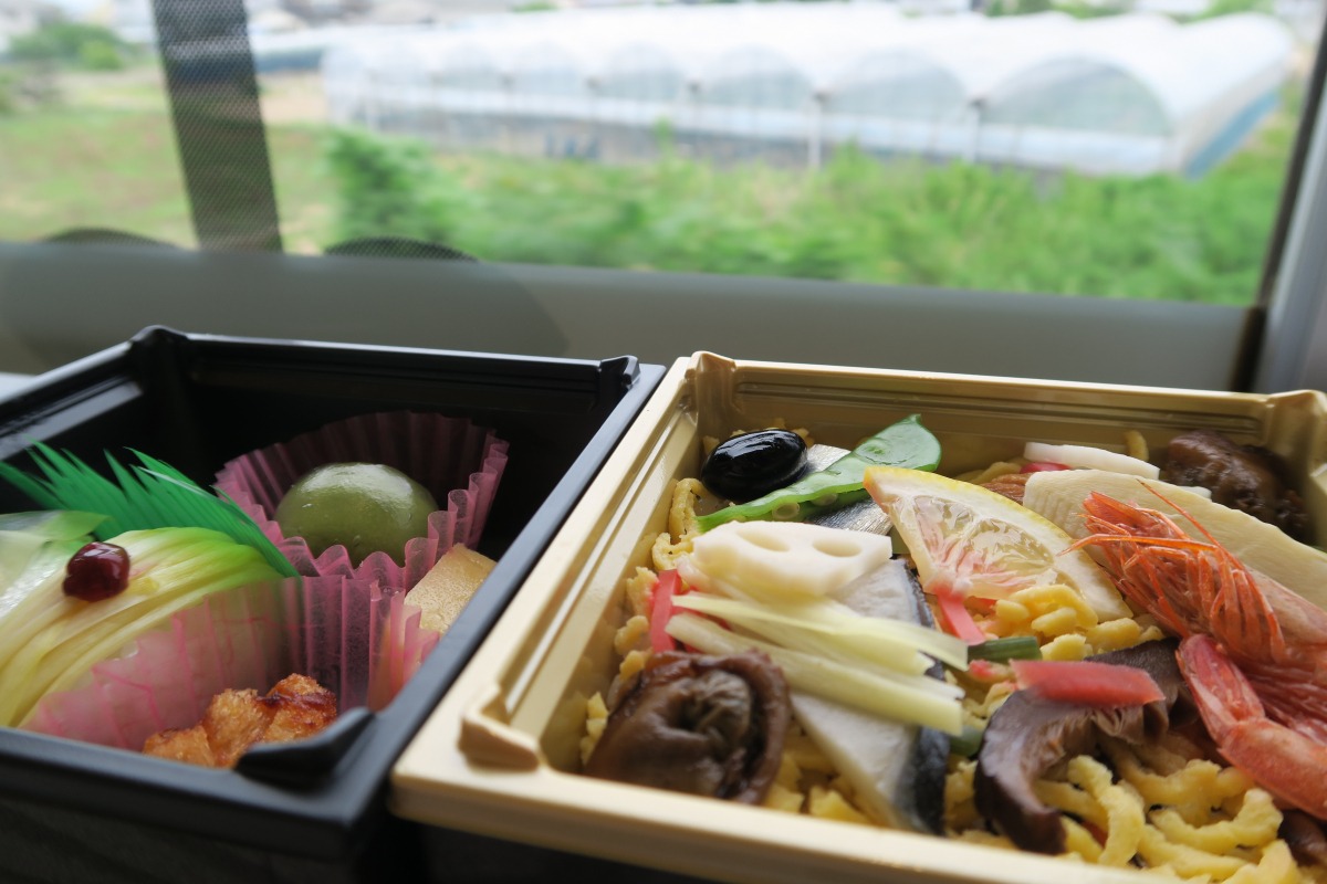 列車の旅で楽しみな駅弁は、岡山の特産品ばら寿司。