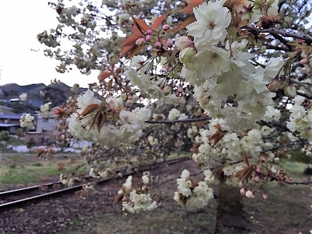 開業当時に植えられたと言われるウコン桜は、今は使われなくなった向かいのホーム跡で可憐な花を咲かせます。4月下旬が見ごろで、駅舎と列車と桜のコラボレーションの写真を撮りに、多くの鉄道ファンが訪れます。