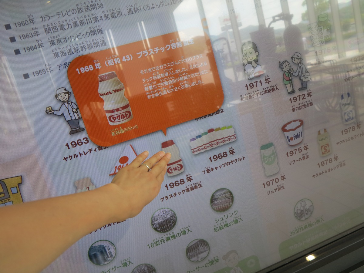 ヤクルトを入れるボトルを製造するエリア、ヤクルトの原料液を調合するエリア、その液をボトルに充填するエリア、完成したヤクルトをまとめて積み上げるエリア…と、たくさんのヤクルトが次々と出来上がっていく様子が見られます。その数なんと、1日約230万本。すごいの一言!