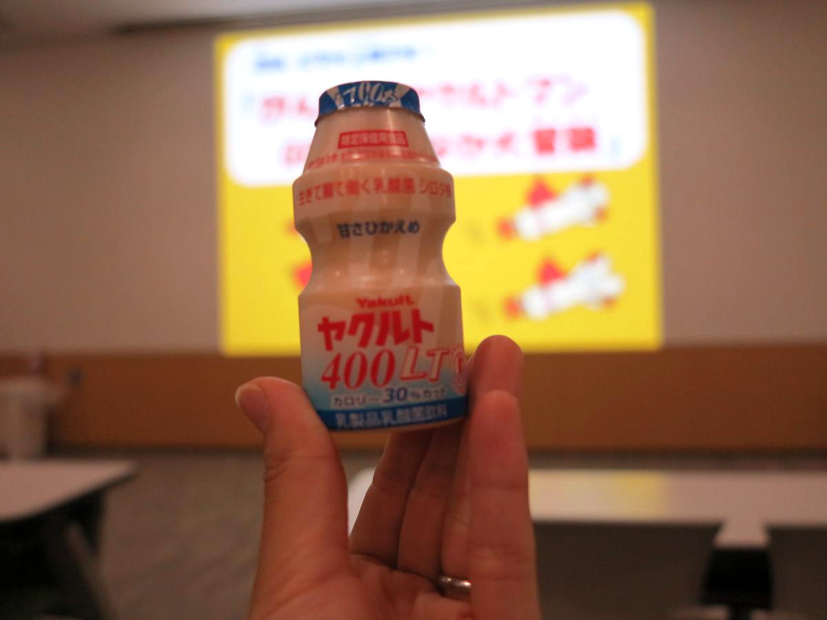 お次は、PRホールでヤクルトの説明アニメやビデオを鑑賞。甘さ控えめで乳酸菌 シロタ株は400億個含まれているという「ヤクルト400LT」をいただきながら。おいしい〜!